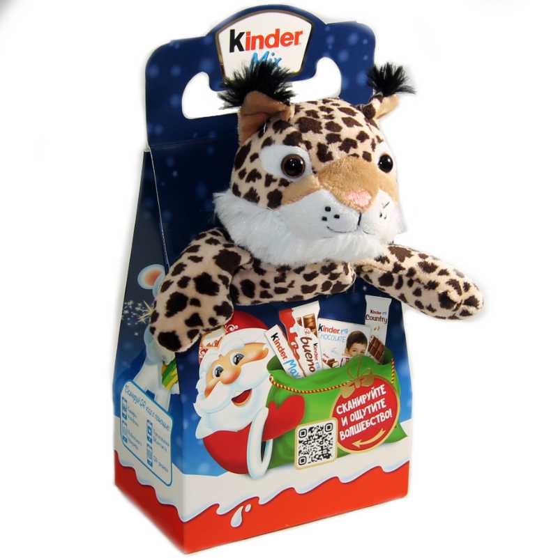 Оригинальная мягкая упаковка в виде символа года с лучшим набором сладостей и шоколадом от Киндер очень понравится ребенку.