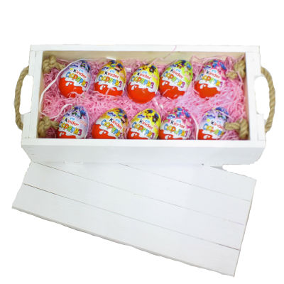 В составе деревянный ящик нашего производства (цвет белый), 10 киндер-сюрпризов, декор