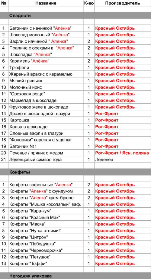 Батончик с начинкой "Алёнка" (1 шт), Шоколад молочный "Алёнка" (1 шт), Вафли с начинкой " Аленка" (2 шт), Пралине с орехами в  "Аленка" (2 шт), Шоколадка "Алёнка" (1 шт), Карамель "Алёнка" (2 шт), Трюфели (1 шт), Жареный арахис с карамелью (1 шт), Мягкий грильяж (1 шт), Молочный ирис (1 шт), "Ореховая роща" (1 шт), Мармелад в шоколаде (1 шт),  Фруктовое желе в шоколаде (1 шт), Конфеты вафельные "Аленка" (2 шт), Конфеты "Аленка" с фундуком (2 шт), Конфеты "Аленка" крем-брюле (2 шт), Конфеты "Мишка косолапый" ваф. (1 шт), Конфеты "Кара-кум" (1 шт), Конфеты "Красный Мак" (1 шт), Конфеты "Маска" (1 шт), Конфеты "Ну-ка отними!" (1 шт), Конфеты "Цитрон" (1 шт), Конфеты "Лебедушка" (1 шт), Конфеты "Черноморочка" (1 шт), Конфеты "Петушок" (1 шт), Конфеты "Toффи" (1 шт)