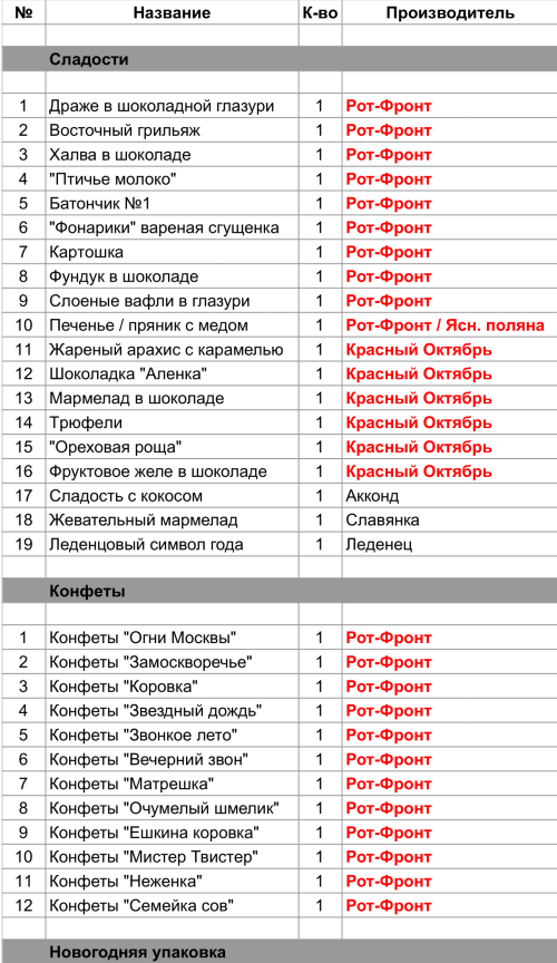 Драже в шоколадной глазури (1 шт), Восточный грильяж (1 шт), Халва в шоколаде (1 шт), "Птичье молоко" (1 шт), Батончик №1 (1 шт), "Фонарики" вареная сгущенка (1 шт), Картошка 1,Фундук в шоколаде (1 шт), Слоеные вафли в глазури (1 шт), Печенье / пряник с медом (1 шт), Конфеты "Огни Москвы" (1 шт), Конфеты "Замоскворечье" (1 шт), Конфеты "Коровка" (1 шт), Конфеты "Звездный дождь" (1 шт), Конфеты "Звонкое лето" (1 шт), Конфеты "Вечерний звон" (1 шт), Конфеты "Матрешка" (1 шт), Конфеты "Очумелый шмелик" (1 шт), Конфеты "Ешкина коровка" (1 шт), Конфеты "Мистер Твистер" (1 шт), Конфеты "Неженка" (1 шт), Конфеты "Семейка сов" (1 шт)